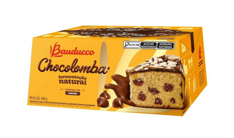 Bauducco Chocolomba a combinação perfeita emtre massa extraordinariamente macia, o sabor das gotas de chocolate, confeito italiano e cobertura de cacau.